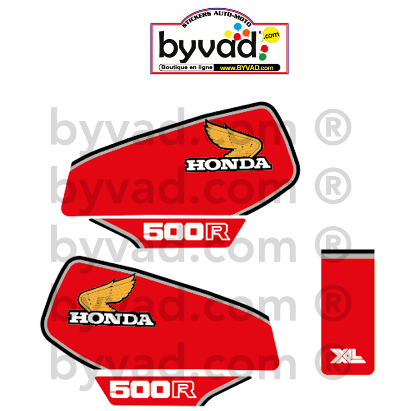 Ce kit comprend les deux stickers de réservoir, les stickers latéraux 500R et le sticker XL de Garde Boue