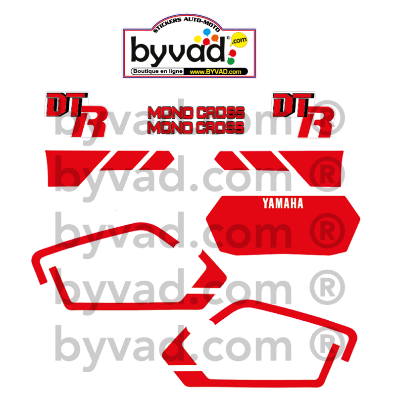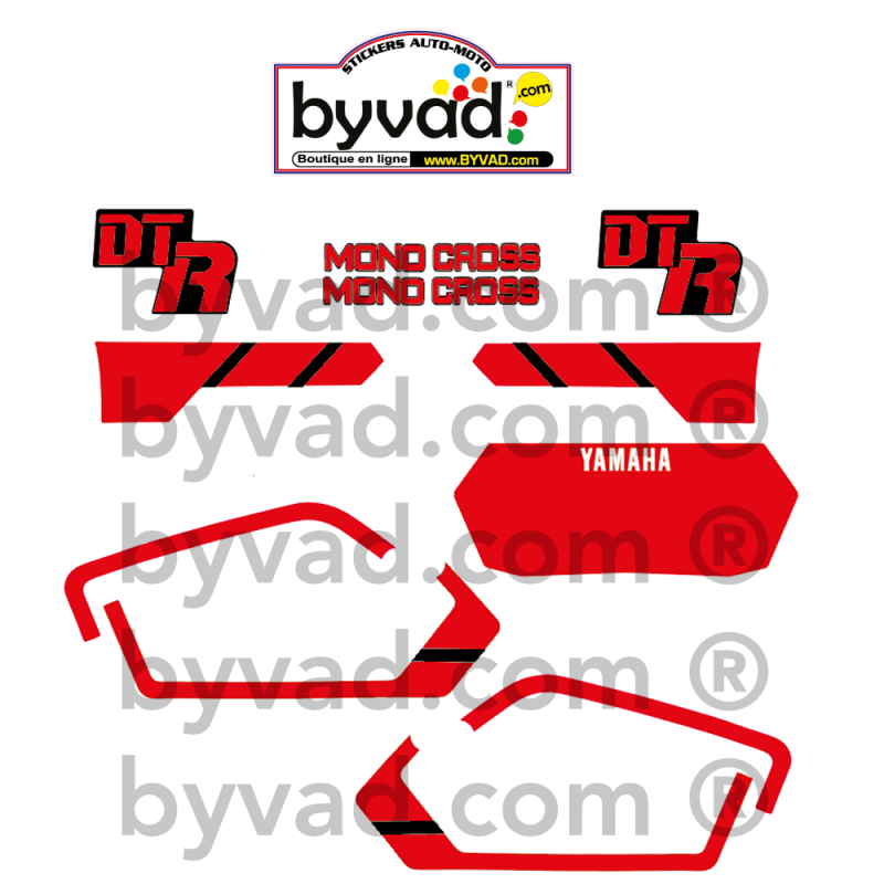Ce kit déco moto est composé des stickers DTR et bandes d'ouïes, des stickers de cache, du sticker de plaque phare et des MONOCROSS pour les bras oscillants