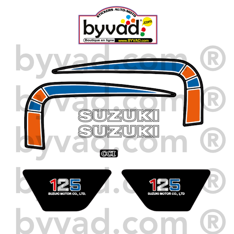 Kit complet comprenant deux autocollants pour le réservoir , deux stickers caches latéraux . deux lettrages SUZUKI et un CCI